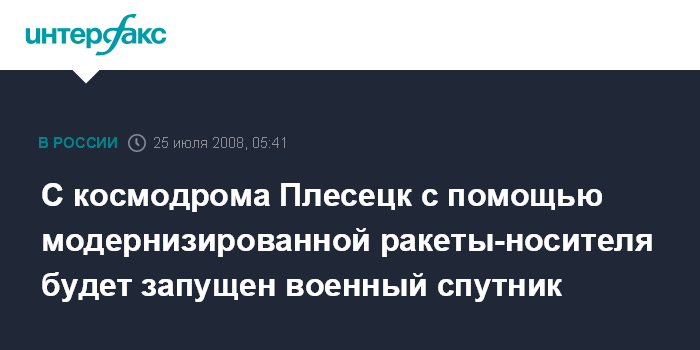 Плесецк (Архангельская обл.). 25 июля. ИНТЕРФАКС-АВН - Спутник военного назначения нового поколения впервые будет запущен с космодрома Плесецк (Архангельская область) с помощью модернизированной ракеты-носителя "Союз-2-1б", сообщил "Интерфаксу-АВН" помощник командующего Космическими войсками Алексей Золотухин.