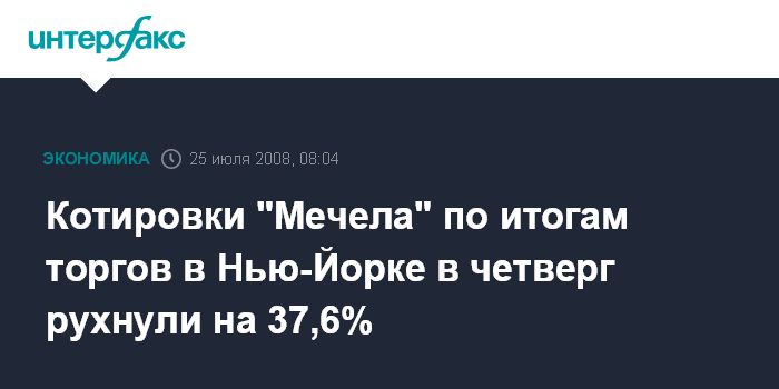 Москва. 25 июля. INTERFAX.RU - Группа "Мечел" после жесткой критики со стороны премьер-министра РФ Владимира Путина потеряла более трети своей капитализации. По итогам сессии на Нью-йоркской фондовой бирже (NYSE) в четверг американские депозитарные расписки (ADR) на акции "Мечела" подешевели на рекордные за все время торгов 37,61% - до $22,84 с $36,61. Капитализация компании сократилась на $5,7 млрд - с $15,2 млрд до $9,5 млрд. "Мечел" утянул за собой вниз и другие российские компании, торгующиеся на NYSE - МТС (падение на 5,47%) и "Вымпелком" (-7,25%).