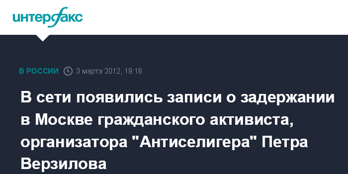 Москва. 3 марта. ИНТЕРФАКС - В ночь на субботу в Москве были задержаны гражданский активист, организатор так называемого "Антиселигера", ранее член арт-группы "Война" Петр Верзилов, а также активист "Яблока" Николай Кузнецов.