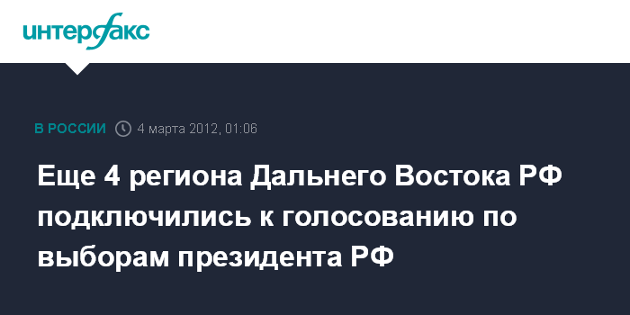 Хабаровск/Биробиджан/Южно-Сахалинск/Владивосток. 4 марта. ИНТЕРФАКС - ДАЛЬНИЙ ВОСТОК - Следом за северными регионами Дальнего Востока к голосованию на выборах президента РФ подключились избиратели еще четырех дальневосточных территорий.