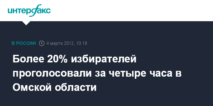 Омск. 4 марта. INTERFAX.RU - Явка избирателей в Омской области на выборах президента, по данным на 12:00 (9:00 мск), составила 20,65%, что на 5% больше, чем на декабрьских выборах в Госдуму, сообщили агентству "Интерфакс-Сибирь" в областном избиркоме в воскресенье. "Всего к полудню проголосовали 322,057 тыс. человек, по сравнению с думскими выборами явка больше на 77 тыс. человек", - сказал собеседник агентства.