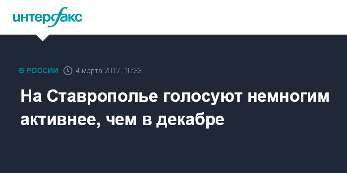 Ставрополь. 4 марта. INTERFAX.RU - Явка избирателей на президентских выборах в Ставропольском крае на 10:00 мск составила 4,58%, сообщили агентству "Интерфакс-Юг" в пресс-службе крайизбиркома. В 2008 году к этому же времени за президента РФ проголосовали 7,05% жителей Ставропольского края, а в декабре 2011 года во время голосования за кандидатов в депутаты Госдумы РФ за первые два часа проголосовали 4,21% избирателей.