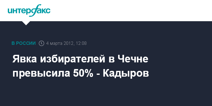Грозный. 4 марта. INTERFAX.RU - В Чечне к полудню преодолен пятидесятипроцентный рубеж явки избирателей на выборах президента России. "Я получил последние данные от избиркома республики. Они свидетельствуют, что к полудню в голосовании приняли участие более 50% избирателей. Это свидетельствует о высокой активности", - заявил глава Чечни Рамзан Кадыров журналистам на избирательном участке в своем родном селе Центорой.