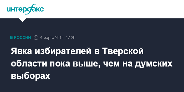 Тверь. 4 марта. INTERFAX.RU - В Тверской области по состоянию на 10:00 мск на выборах президента РФ проголосовали 4,19% (46,9 тыс. человек) избирателей, сообщила председатель облизбиркома Валентина Дронова на брифинге в воскресенье. "По сравнению с прошедшими в декабре 2011 года выборами в Государственную думу явка выше - тогда на 10 утра участие в голосовании приняли 3,17% избирателей", - отметила председатель облизбикома.