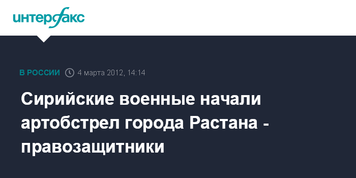 Бейрут. 4 марта. INTERFAX.RU - Армия Сирии начала в воскресенье артобстрел позиций вооруженных оппозиционеров в городе Растане, сообщают в Сирийском наблюдательном совете по правам человека. "С раннего утра позиции, занимаемые дезертировавшими из армии военными на севере Растана, подвергаются интенсивному обстрелу", - говорится в заявлении правозащитников.