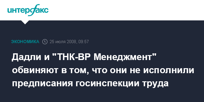 Москва. 25 июля. INTERFAX.RU - ОАО "ТНК-BP Менеджмент" и глава компании Роберт Дадли не в полном объеме исполнили предписание государственной инспекции труда Москвы, говорится в акте о результатах проверки исполнения предписания, копией которого располагает Агентство нефтяной информации (АНИ).