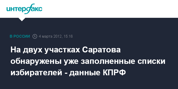 Саратов. 4 марта. INTERFAX.RU - В Ленинском районе Саратова на избирательных участках №183 и №184, расположенных в школе №41, члены теризбиркома с правом совещательного голоса от КПРФ и "Справедливой России" обнаружили уже заполненные "задвоенные" списки избирателей.