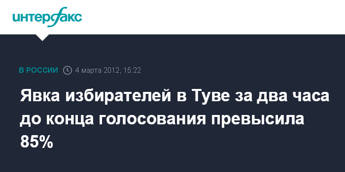 Кызыл. 4 марта. INTERRAX.RU - В Туве, по данным на 18:00 по местному времени (14:00 мск), в выборах президента России приняли участие 85,77% избирателей, сообщает республиканская избирательная комиссия в воскресенье.