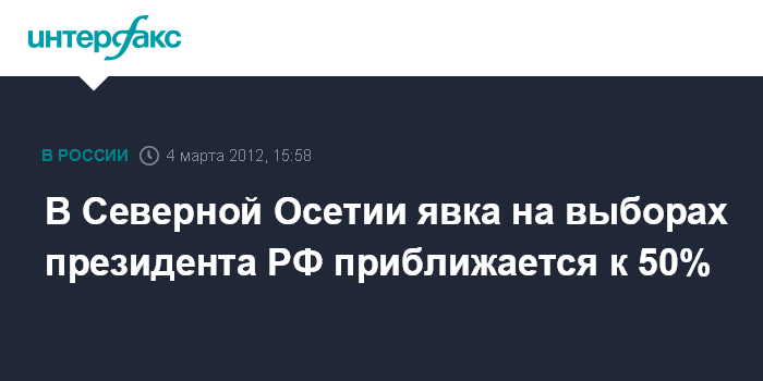 Владикавказ. 4 марта. INTERFAX.RU - В Северной Осетии, по данным на 15:00 мск, на выборах президента России и в местные органы власти проголосовало 47% избирателей республики. "К 15:00 явка избирателей составила 47%, что составляет 234 тыс. 594 человека от общего числа избирателей", - сообщила агентству "Интерфакс-Юг" секретарь республиканской центральной избирательной комиссии Ольга Маркова.