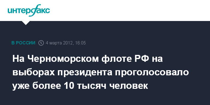Симферополь. 4 марта. INTERFAX.RU - По состоянию на 15:00 мск, на Черноморском флоте РФ проголосовало 10 014 избирателей, сообщила агентству "Интерфакс-Украина" сотрудник генерального консульства России в Симферополе. В то же время на участке №5263, расположенном в генконсульстве РФ в Симферополе, проголосовало 1 тысяча 32 избирателя.