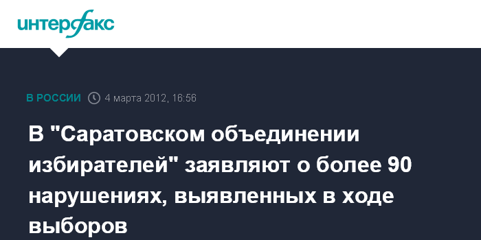 Саратов 4 марта. INTERFAX.RU - В Саратовской области в ходе выборов президента активисты "Саратовского объединения избирателей" (СОИ) и членов-организаций партнеров СОИ сообщили о более чем 90 нарушениях выборного законодательства, заявил "Интерфаксу" координатор СОИ Дмитрий Коннычев.