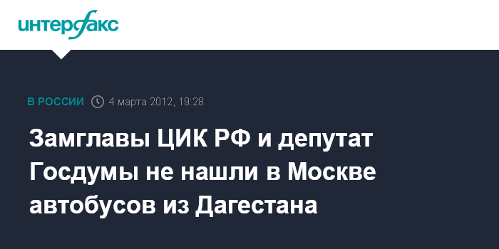 Москва. 4 марта. INTERFAX.RU - Информация одного из участников "Лиги избирателей" о том, что в Москве якобы обнаружено около 500 автобусов с иногородними номерами, в основном, дагестанскими, не подтвердилась, заявили в Центризбиркоме РФ.