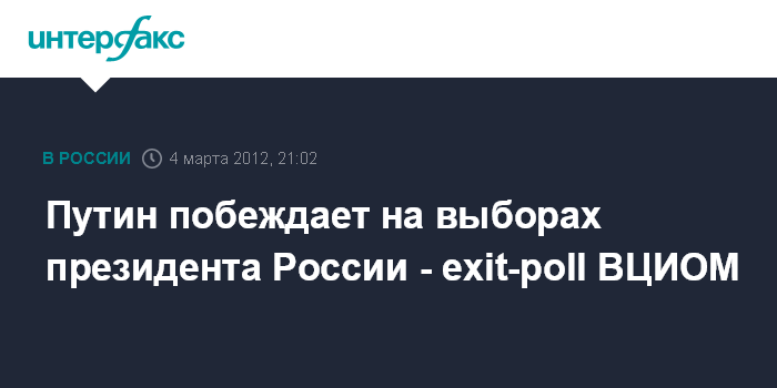 Согласно неофициальному опросу избирателей на выходе с участков (exit-polls), проведенному ВЦИОМ по заказу ВГРТК, за В.Путина проголосовало 58,3% избирателей.