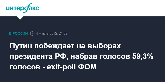 Москва. 4 марта. INTERFAX.RU - Владимир Путин одерживает победу на выборах президента России, получив продержку 59,3 % голосов избирателей.