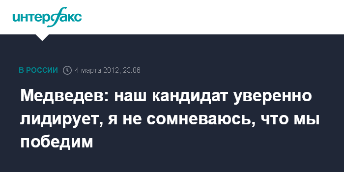 Москва. 4 марта. INTERFAX.RU - Президент России Дмитрий Медведев заявил, что он уверен в победе на президентских выборах Владимира Путина.