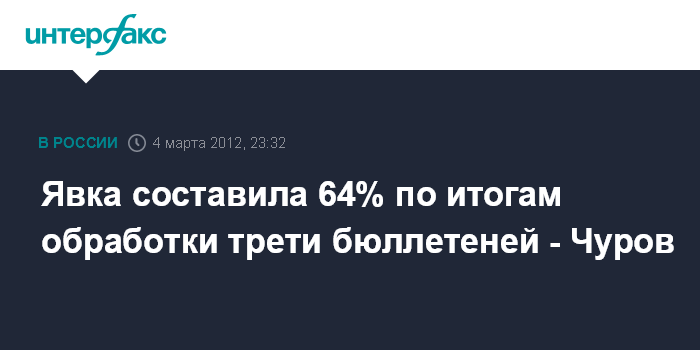 Москва. 4 марта. INTERFAX.RU - Явка избирателей на президентских выборах 4 марта составила 64%, сообщил в интервью телеканалу "Россия 24" глава ЦИК РФ Владимир Чуров.
