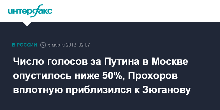 Число голосов за Путина в Москве опустилось ниже 50%, Прохоров вплотную приблизился к Зюганову