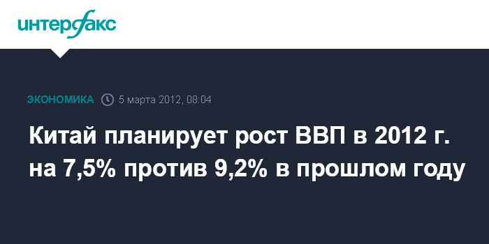 Пекин. 5 марта. INTERFAX.RU - Рост ВВП Китая в 2012 году должен составить 7,5%, при этом целью является стабильное и устойчивое развитие экономики, снижение финансовых рисков, сообщил в понедельник премьер Госсовета КНР Вэнь Цзябао, сообщают местные СМИ.