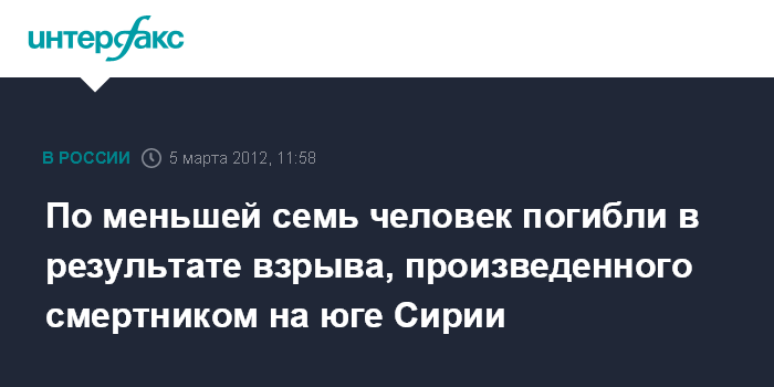 Бейрут/Лондон. 5 марта. INTERFAX.RU - Не менее семи человека погибли и десятки были ранены в результате подрыва смертником автомобиля, начиненного взрывчаткой, в городе Деръа на юге Сирии, сообщили местные власти.