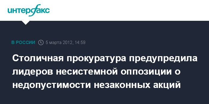 Москва. 5 марта. INTERFAX.RU - Прокуратура Москвы предупредила о необходимости строгого соблюдения закона и об ответственности за его нарушение ряд оппозиционных лидеров, в том числе Эдуарда Лимонова, Алексея Навального, Бориса Немцова, Сергея Удальцова и других, планирующих, по ее данным, несанкционированные акции.