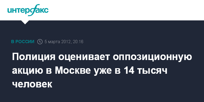 Москва. 5 марта. INTERFAX.RU - Около 14 тысяч человек принимают участие в митинге оппозиции на Пушкинской площади, сообщили "Интерфаксу" в пресс-службе ГУ МВД России по Москве. "На Пушкинской площади собрались около 14 тысяч человек", - сказали в пресс-службе.