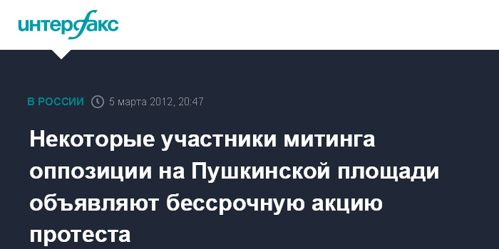Москва. 5 марта. INTERFAX.RU - Часть участников оппозиционного митинга на Пушкинской площади в Москве отказываются покидать площадь, объявив бессрочную акцию протеста, сообщил организатор митинга Сергей Удальцов.
