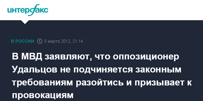 В МВД заявляют, что оппозиционер Удальцов не подчиняется законным требованиям разойтись и призывает к провокациям