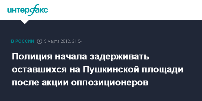 Москва. 5 марта. INTERFAX.RU - Бойцы ОМОН начали задержания участников митинга "За честные выборы!" на Пушкинской площади, которые не стали расходиться после окончания акции.