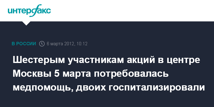 Москва. 6 марта. INTERFAX.RU - Два человека попали в больницы после митингов в Москве, сообщил "Интерфаксу" источник в медицинских кругах столицы.