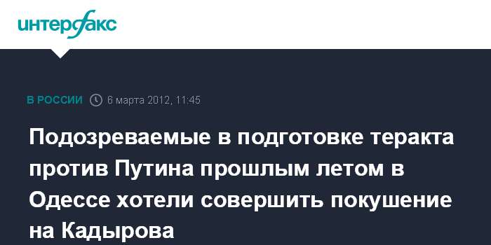 Киев. 6 марта. INTERFAX.RU - Задержанные в Одессе террористы, подозреваемые в подготовке покушения на премьер-министра РФ Владимира Путина, готовили также покушение на главу Чеченской Республики Рамзана Кадырова, сообщила во вторник газета "Сегодня" со ссылкой на одного из сотрудников одесского областного УВД.