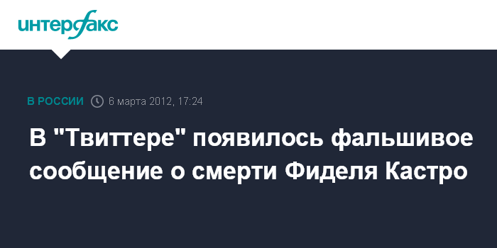 Мадрид. 6 марта. INTERFAX.RU - Фальшивое сообщение о смерти лидера кубинской революции Фиделя Кастро появилось в микроблоге "Твиттер", сообщает интернет-сайт испанской газеты "Гасета".