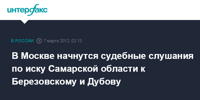 Москва. 7 марта. ИНТЕРФАКС - Симоновский суд Москвы в среду приступит к рассмотрению по существу иска правительства Самарской области с требованием взыскать почти миллиард рублей с предпринимателя Бориса Березовского и его компаньона Юлия Дубова, заочно осужденных в рамках дела "ЛогоВАЗа" и "АвтоВАЗа".