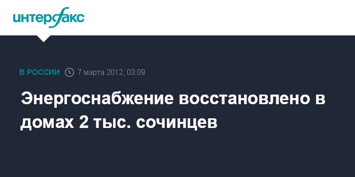 Краснодар. 7 марта. ИНТЕРФАКС-ЮГ - Специалисты "Кубаньэнерго" восстановили энергоснабжение в домах 2 тыс. жителей Сочи.