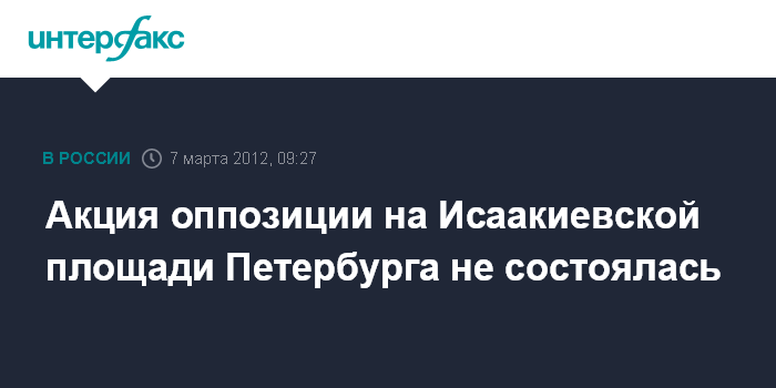 Санкт-Петербург. 7 марта. INTERFAX.RU - Полицейские не зафиксировали попытку проведения несанкционированной акции оппозиции на Исаакиевской площади Петербурга во вторник, сообщили "Интерфаксу" в пресс-службе главного управления МВД по городу и Ленинградской области.