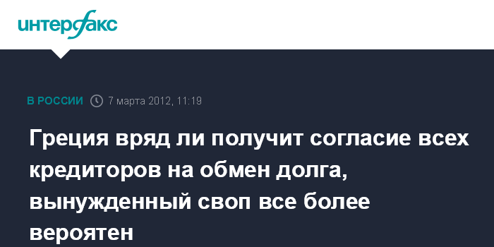 Афины. 7 марта. INTERFAX.RU - Греция вряд ли получит согласие 100% владельцев облигаций на обмен долга до конечного срока, назначенного на вечер четверга, при этом страна в очередной раз заявила, что готова заставить инвесторов пойти на ее условия, пишет газета The Wall Street Journal.