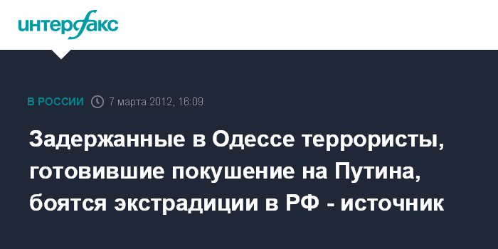 Киев. 6 марта. INTERFAX.RU - Подозреваемые в подготовке покушения на премьер-министра РФ Владимира Путина, задержанные в Одессе, надеются получить на Украине минимальный тюремный срок по ст. 263 (незаконное обращение с оружием и взрывчаткой) УК, и боятся экстрадиции в Российскую Федерацию, сообщил агентству "Интерфакс-Украина" источник в украинских правоохранительных органах.