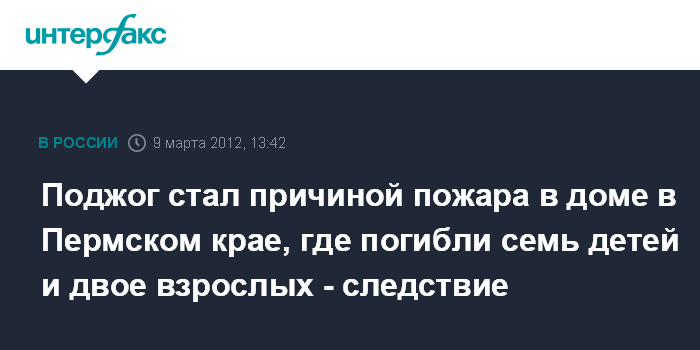 Москва. 9 марта. INTERFAX.RU - Следственные органы возбудили уголовное дело по статье "Убийство" по факту пожара в селе Моховое Пермского края, где погибли девять человек, в том числе семеро детей. "По предварительным результатам осмотра места происшествия, причиной пожара является поджог. В результате произошло задымление помещения. От отравления угарным газом 34-летний мужчина, его супруга и семеро детей в возрасте от 4 до 13 лет скончались", - сообщается в пятницу на сайте СКР.