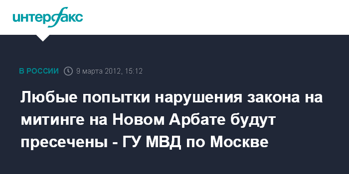 Москва. 9 марта. INTERFAX.RU - Столичные полицейские предупреждают о недопустимости нарушений общественного порядка на субботнем митинге оппозиции на Новом Арбате, говорится в сообщении, опубликованном в пятницу на сайте ГУ МВД России по Москве. "Московская полиция сделает все, чтобы не допустить нарушений общественного порядка. Любые попытки противоправных действий будут пресекаться в строгом соответствии с нормами действующего законодательства, а виновные привлекаться к установленной законом ответственности", - говорится в сообщении.