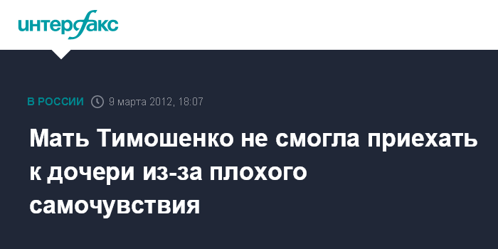 Харьков. 9 марта. INTERFAX.RU - Мать экс-премьера Юлии Тимошенко не смогла приехать на свидание в Качановскую исправительную колонию в Харьков, потому что плохо себя чувствует, сообщил защитник Ю.Тимошенко Сергей Власенко. "Людмила Николаевна (мама Ю.Тимошенко - ИФ), к сожалению, не смогла приехать по состоянию здоровья. Она, конечно, очень хотела увидеть Юлию Владимировну, но состояние здоровья не позволило ей приехать", - сказал С.Власенко журналистам.