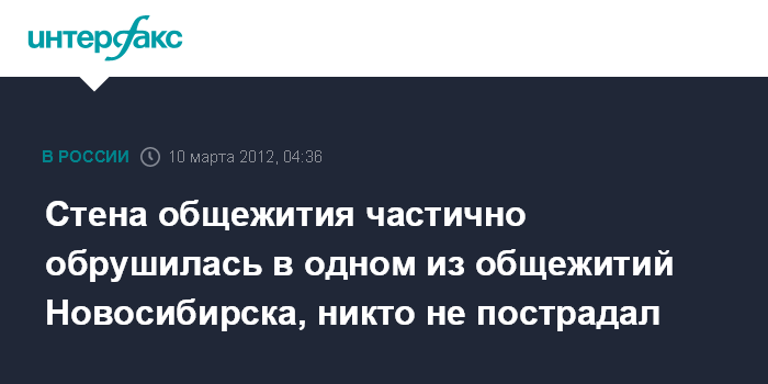 Чита. 10 марта. ИНТЕРФАКС-СИБИРЬ - В Новосибирске на улице Станиславского обрушилась стена пятиэтажного здания между третьим и четвертым этажами, пострадавших нет, сообщает пресс-служба областного ГУ МЧС.