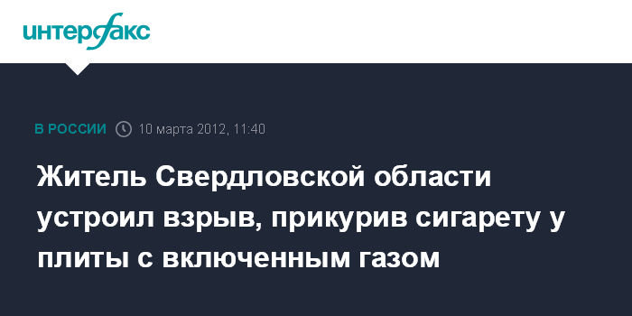 Около трех часов ночи местный житель 1969 г.р. после ссоры со своей супругой решил свести счеты с жизнью, сообщил агентству "Интерфакс-Урал" руководитель пресс-службы ГУ МВД РФ по Свердловской области Валерий Горелых. "Он открыл газ на кухне, а спустя непродолжительное время решил покурить, прикурив сигарету от конфорки. В результате произошло мощное объемное воспламенение - хлопок без последующего пожара. Все местные жители расценили его как взрыв", - сказал он.