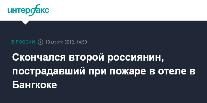 Бангкок. 10 марта. INTERFAX.RU - Число граждан России, ставших жертвами пожара в отеле "Гранд-парк авеню" в столице Таиланда Бангкоке, увеличилось до двух, сообщили журналистам местные медицинские работники и официальные лица.