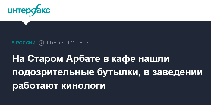 Москва. 10 марта. INTERFAX.RU - Одно из кафе на Старом Арбате проверяют кинологи из-за подозрительных бесхозных бутылок, сообщили "Интерфаксу" в пресс-службе ГУ МВД России по Москве.