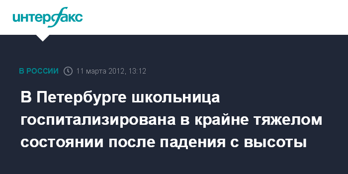Санкт-Петербург. 11 марта. INTERFAX.RU - Главное следственное управление СКР по Петербургу проводит проверку по факту падения с высоты 13-летней школьницы, сообщает сайт ведомства в воскресенье.