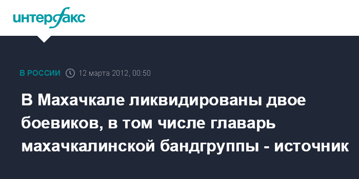 Махачкала. 12 марта. ИНТЕРФАКС-ЮГ - Двое боевиков ликвидированы при оказании вооруженного сопротивления в Махачкале, один из них опознан как главарь махачкалинской диверсионно-террористической группы Эльдос Зульфугаров, сообщил "Интерфаксу" источник в правоохранительных органах Дагестана.