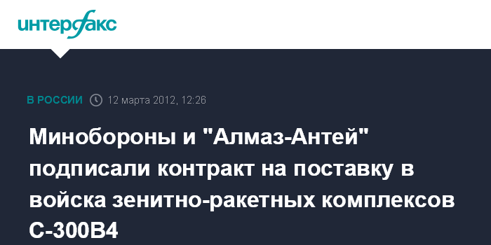Москва. 12 марта. INTERFAX.RU - Министр обороны РФ Анатолий Сердюков и генеральный директор ОАО "Концерн ПВО "Алмаз-Антей" Владислав Меньщиков подписали трехгодичный государственный контракт на поставку зенитных ракетных систем С-300В4, сообщили "Интерфаксу-АВН" в управлении пресс-службы и информации Минобороны РФ.