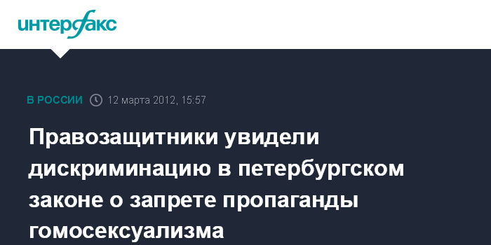Москва. 12 марта. INTERFAX.RU - Правозащитники заявили, что закон о запрете пропаганды гомосексуализма, который подписал губернатор Санкт-Петербурга, нарушает Европейскую конвенцию по правам человека. "Мы, правозащитники и гражданские активисты, выражаем крайнюю обеспокоенность в связи с принятием ряда дискриминационных законодательных актов, которые имели место в Рязанской, Архангельской, Костромской областях, а теперь и в Санкт-Петербурге", - говорится в заявлении правозащитников, поступившем в "Интерфакс" в понедельник.
