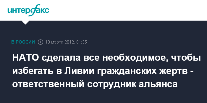 По просьбе агентства он прокомментировал заявление главы МИД России Сергея Лаврова в Совете Безопасности ООН о том, что информация о гражданских жертвах бомбардировок НАТО в Ливии до сих пор не расследована.