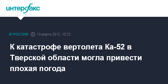 Москва.13 марта. INTERFAX.RU - Причиной катастрофы вертолета Ка-52 под Торжком, скорее всего, могли стать неблагоприятные погодные условия в зоне полетов, сообщил "Интерфаксу-АВН" во вторник источник, знакомый с ситуацией.