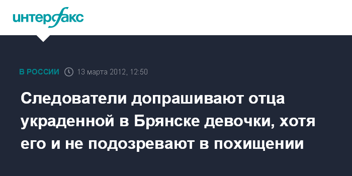 Брянск. 13 марта. INTERFAX.RU - Следственные органы приступили к допросу отца похищенной в Брянске 9-месячной девочки, сообщил в понедельник "Интерфаксу" старший помощник руководителя по взаимодействию со СМИ СУ СК России по Брянской области Сергей Цыганок.
